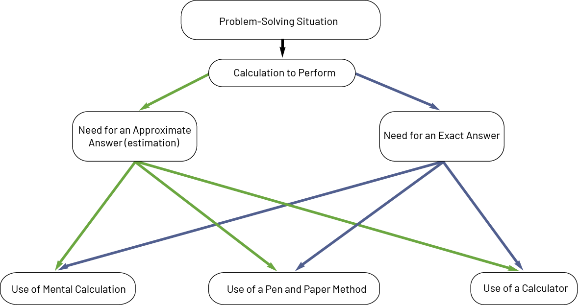 Whether it is a problem with one operation or multiple operations, students must make decisions and choices based on the context. A problem-solving approach will introduce them to this thinking. When faced with a problem, they must first analyze it to determine the data and understand that a calculation must be performed. Then, depending on the context, one must know whether one is looking for an approximate or an exact answer. In both cases, depending on the context and the numbers involved, it is then necessary to determine whether the calculation will be performed mentally, in writing or using a calculator. Finally, the desired calculation is performed.