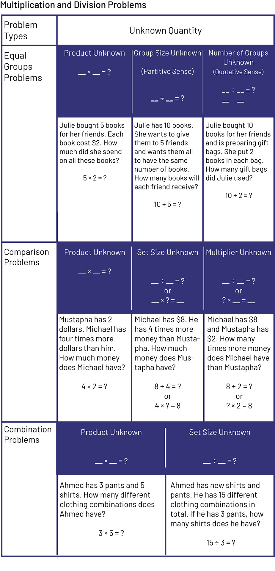 It is essential that students have experience with both types of division problems, as they will develop a deeper understanding of the operation, which is fundamental to many other mathematical concepts. It is not necessary for students to know the names of the problem types, but it is essential that they have the opportunity to solve a variety of problem types while using a variety of strategies.