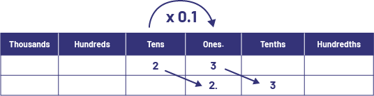 To multiply by one tenth, I visualized a shift of the number one column to the right in the place value chart.