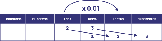 To multiply by one hundredth, I visualized a shift of the number two columns to the right in the place value chart.