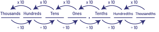 Note: Some students are under the impression that the decimal point is the centre of the decimal system. As a result, they tend to call the first position to the right of the decimal point the oneth rather than the tenth position. It is also important that students understand the \( \times\; 10 \) multiplicative relationship that exists between adjacent place values. Students should have previously developed an understanding of this relationship in the study of whole numbers, such that each place has a value 10 times greater than the one to its right and 10 times smaller than the one to its left.