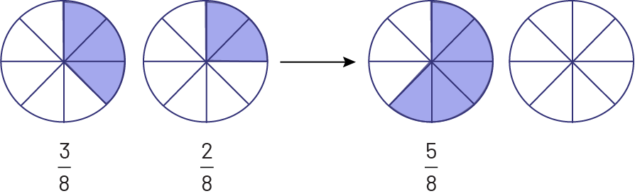 However, it is not always clear to students that addition is related to the numerator. In a situation where there are three eighths (\(\frac{3}{8}\)) left of a pizza and two eighths (\(\frac{2}{8}\)) left of another pizza of the same size, we look at how many are left in total. We are counting eighths, not sixteenths, even thought the pizzas had a total of 16 pieces.