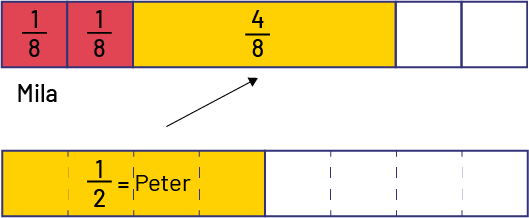 Mila ate \(\frac{2}{8}\) of a submarine sandwich, while Peter ate \(\frac{1}{2}\). What fraction of the submarine sandwich was eaten by the two children?
