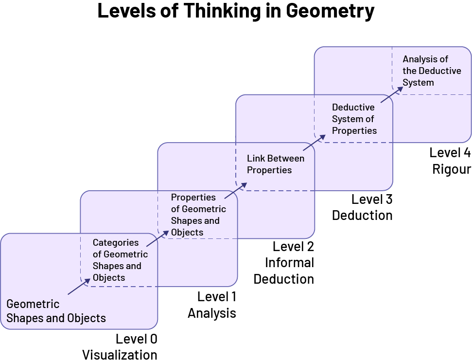 Two Dutch researchers, Dina Van Hiele-Geldof and Pierre Van Hiele, have devised a five-level model to describe the understanding of geometric concepts at different stages of a student's thinking development. Students can progress from one level of thought to another when they do activities aimed at comparing and classifying geometric shapes and objects and analyzing their properties. Teachers who recognize students' levels of thinking, based on certain observable behaviours, are better able to support students in performing geometric analyses and gradually developing their ability to reason.