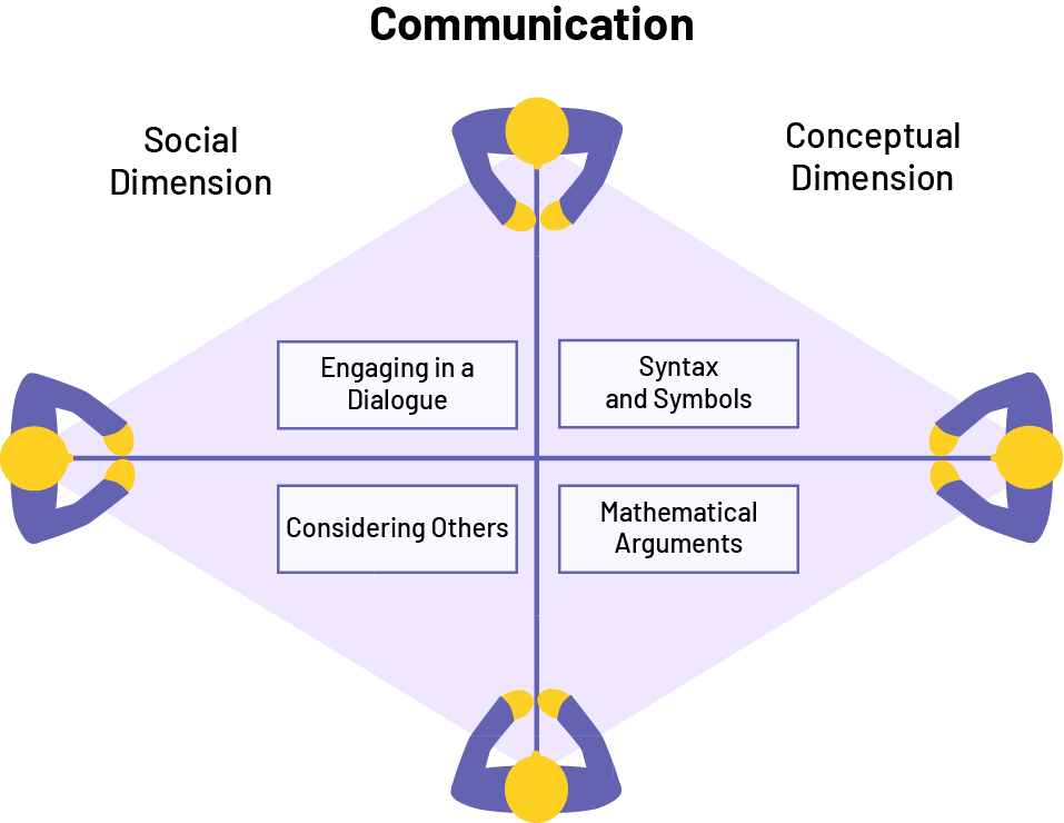 Image Infographic named: communication. Four people are sitting at a table. They are each sitting at a corner of a diamond-shaped table. Above to the left, we can read: social dimension. Above to the right, we can read: conceptual dimension. The people sitting across from each other are linked by a blue line. This divides the table in 4 parts. These parts represent an idea: syntax and symbols; mathematical arguments; considering the others; engaging in a dialogue.