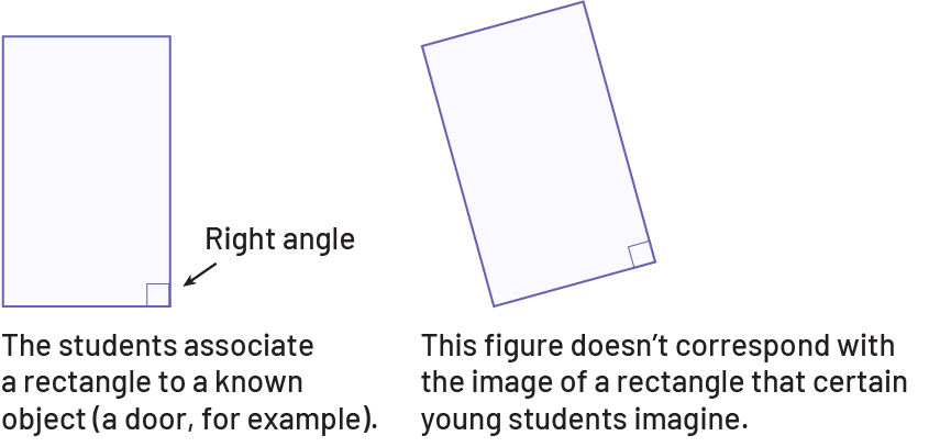 Image Students associate a rectangle to a known object, for example, a door. The text is accompanied by a drawing of a rectangle and its square angle. This figure doesn’t correspond with the image of a rectangle that certain students imagine. The text is accompanied by a drawing of a rectangle and its square angle in an oblique posture.