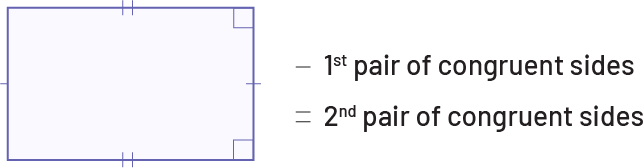 Image A rectangle with dashes on the parallel sides and the square angles. A dash, first pair of congruous sides. 2 dashes, second pair of congruous sides.