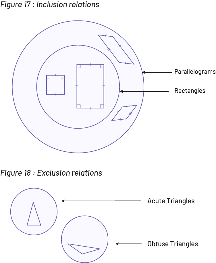 Image Inclusion relations: Two circles, one is in the other. The larger one represents a set of parallelograms, examples are drawn. The smaller circle is a set of rectangles. Exclusion relations: Two circles are represented, individually. The first represents the acute triangles, the second represents the obtuse triangles. An example is placed in each circle.