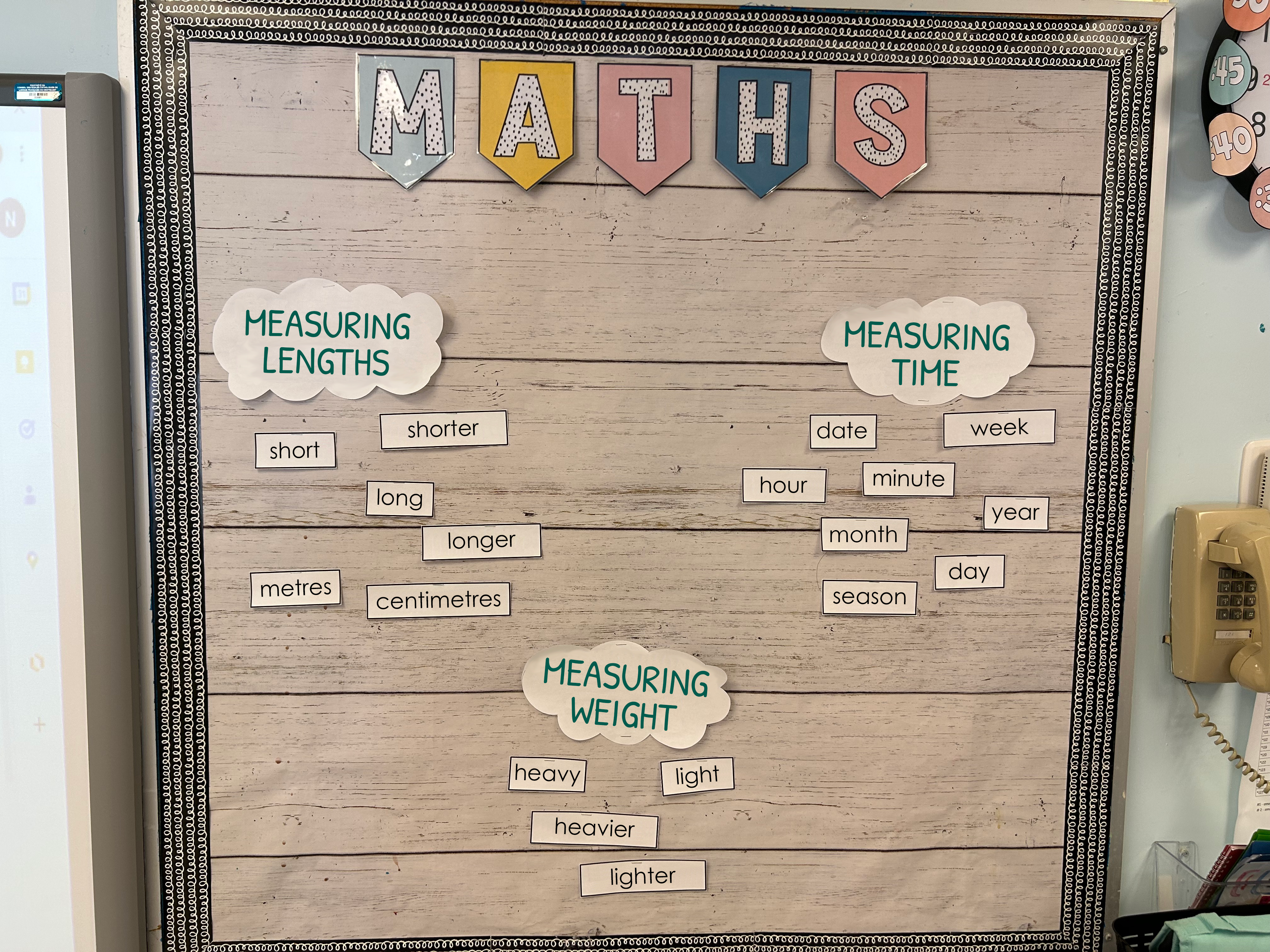 Image A wall of words for mathematic vocabulary. Measuring lengths: short, shorter, long, longer, meter, centimeter. Measuring time: day, week, hour, minute, year, month, day, season. Measuring weight: heaving, light, heavier, lighter.In summary, written communication allows students to: