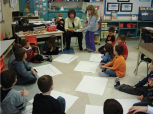 Image Students are sitting, in a circle, on the ground, they have large sheets of paper before them. The teacher is with them. She looks at the work of the presenting student.