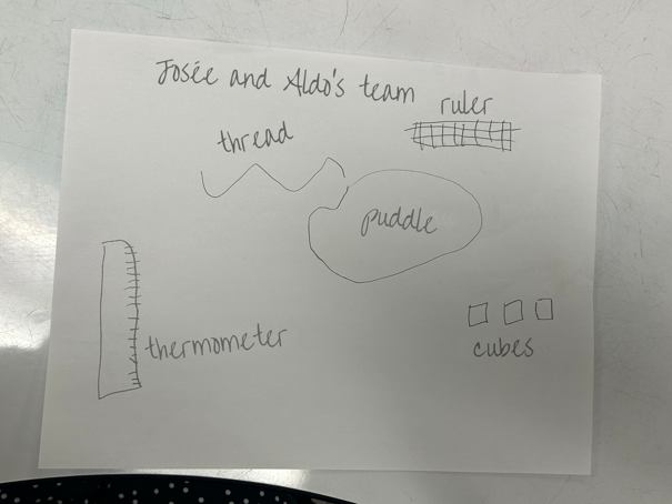 Image An example of student work where the latter have put on paper a representation of their approach. The name of the team, the material used, a thermometer, cubes, a water puddle, thread, a ruler.