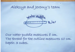 Image Reproduction of student’s work where they put on paper a representation of their approach. The name of the team, the material used, a thermometer, cubes, a water puddle, thread, a ruler.Note: The order of the presentations chosen allows for two different strategies of representations to be shown to elicit student reflection and discussion. It can be seen that the strategies on the right-hand representation are more detailed and precise than the one on the left. The explanations given make it possible to observe the progression of understanding of the concept.