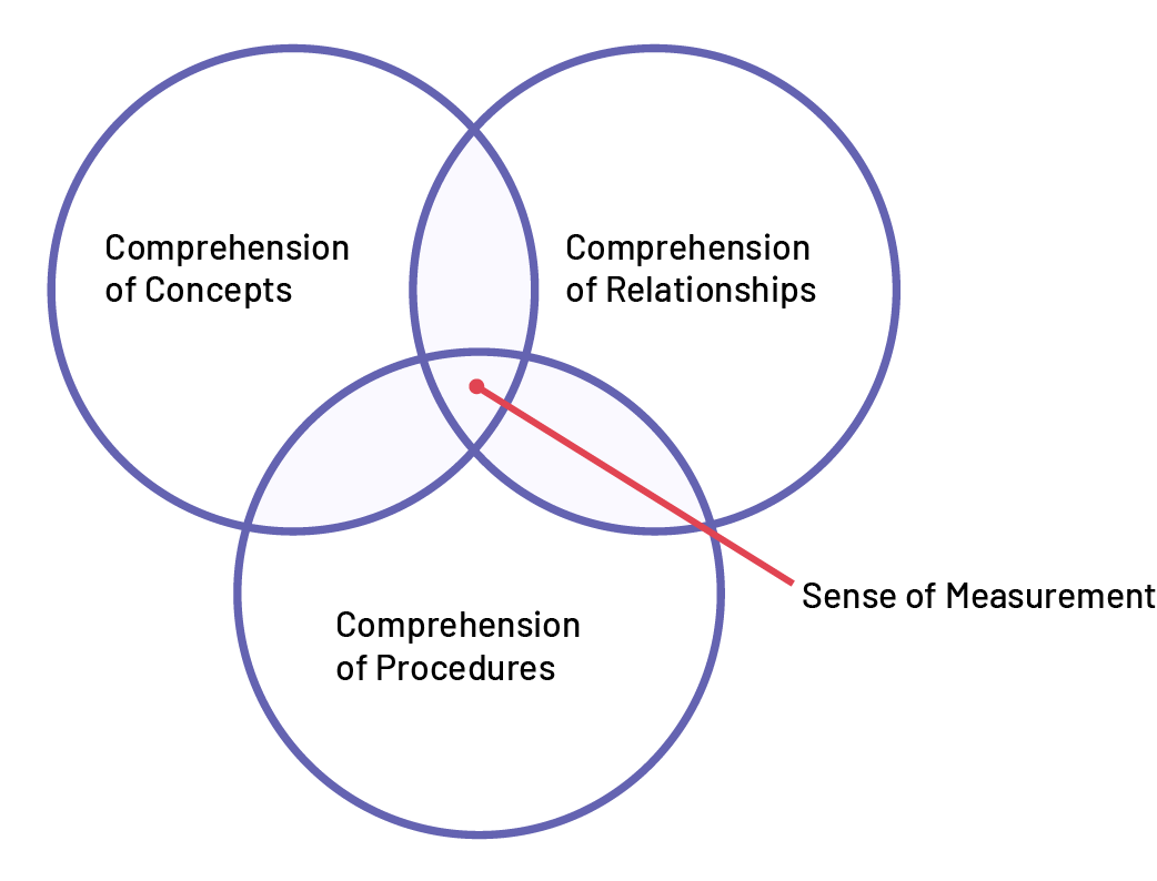 Image Venn diagram made up of three circles. The shared section of the three circles is the sens of the measure. Circle one: comprehension of the concepts. Circle 2: comprehension of the relations. Circle 3: comprehension of the procedures.The meaning of measurement is to build concepts related to measurement, establish relationships in measurement and know how to apply procedures to determine the measurement of an object.