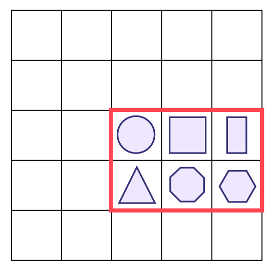 image A grid of 5 columns and 5 rows. There are 25 cells. In the third cell of the third column, there is a circle, in the cell below, there is a triangle. In the third cell of the fourth column, there is a square, in the cell below, there is an octagon. In the third cell of the fifth column, there is a rectangle, in the cell below, there is a hexagon. A red line forms a rectangle around the cells that have a shape.