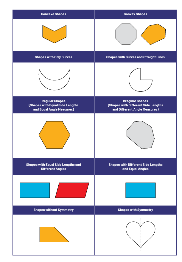 image A table that classifies flat shapes, with examples. 1- flat concave shapes, with an example. 2- Flat convex shapes: example of the octagon and another shape. 3- Flat shapes with only curved lines: example of the crescent moon. 4- Flat shapes with curved lines and straight lines, example of a three-quarter circle. 5-Regular flat shapes (opening parenthesis) figures with congruent sides and angles (closing parenthesis). Example of a hexagon. 6- Irregular shapes ( open parenthesis) shapes with different lengths of sides and different angles (close parenthesis). There is an example. 7-Two flat shapes with sides of the same length, but different angles. The examples are a rectangle and a parallelepiped. 8-Flat shapes with different side lengths, but congruent angles. The example is a rectangle. 9- Non-symmetrical flat shapes. There is an example. 10- Symmetrical shapes. The example is a heart. The axis of symmetry is drawn with a dotted line.