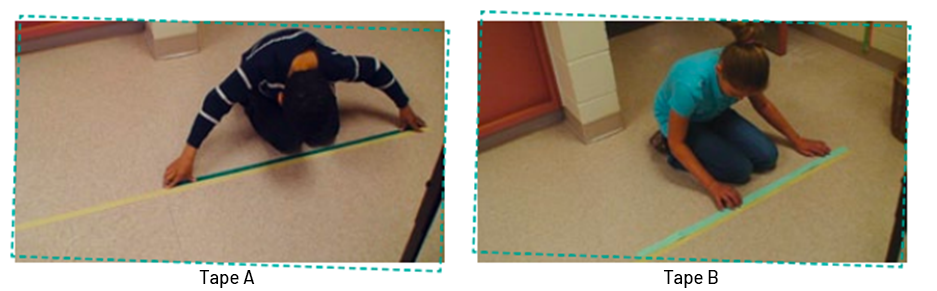image A student kneels in front of a line drawn on the floor. He/she measures the line with a tape measure in centimeters, "Tape "A"". A student kneels in front of a line drawn on the floor. He measures this line with an ungraded tape measure. He measures the line with a tape measure in centimeters, "Tape measure "B"".