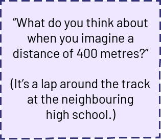 Image In a box it says: "What do you think of when you imagine a distance of 400 meters?" ( Open parenthesis) It's a lap around the high school track next door ( Close parenthesis).