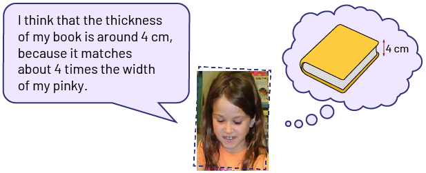 Image The face of a student, a speech bubble is associated with it. It says: "I think the thickness of my book is about 4 centimeters, because it is about 4 times the width of my little finger. A thought bubble is associated with the student, it reads: "the book and a double arrow at the thickness, 4 centimeters.