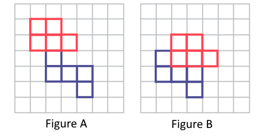 Image On two grid spaces, two pentominoes are used to make a shape. The two pentomino shapes are determined by the colors red and blue. In the first grid, the shape looks like a flower. In the second grid, the pentominoes are interlocked.