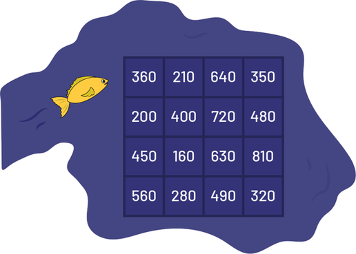 Image A fish enters a lake. It's heading towards a grid made up of 4 columns and 4 rows. The numbers in the boxes are as follows: 360, 210, 640, 350, 200, 400, 720, 480, 450, 160, 630, 810, 560, 280, 490, 320.