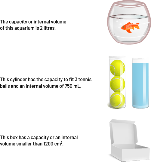 image Three pictures: A fish in an aquarium; a cylinder containing three tennis balls and a cylinder filled with water; and a cardboard box. Next to the picture of the aquarium is written: the capacity or volume of this aquarium is two liters. Next to the picture of the cylinders is written: this cylinder has a capacity of three tennis balls and an interior volume of 750 milliliters. Next to the picture of the cardboard box is written: This box has a capacity or interior volume of one thousand 200 cubic centimeters.