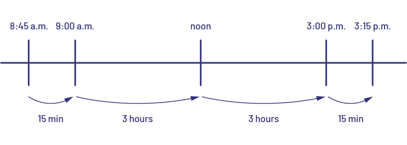 image A horizontal line that marks the time between 8:45 and 9:00, 9:00 and 12:00, 12:00 and 15:00, and 15:00 and 15:15. The intervals are indicated by arrows: the first is 15 minutes, the second is three hours, the third is three hours, and the fourth is fifteen minutes.