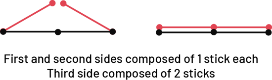 image A horizontal segment of three sticks. Two segments of two sticks diagonally upward, each starting from the ends of the first stick, do not quite meet in the center. To the right of the first set of sticks is a second set. In this one, there are two segments of three horizontal sticks of equal length one on top of the other. Under the image is written: sides of one, one and two sticks