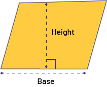 image There is a parallelogram. A vertical dotted line passes through the center of the parallelogram and a horizontal dotted line passes through the base. Next to the vertical line is labeled: height. Under the horizontal line is labeled: base. The point where the vertical and horizontal lines meet is marked by a square.