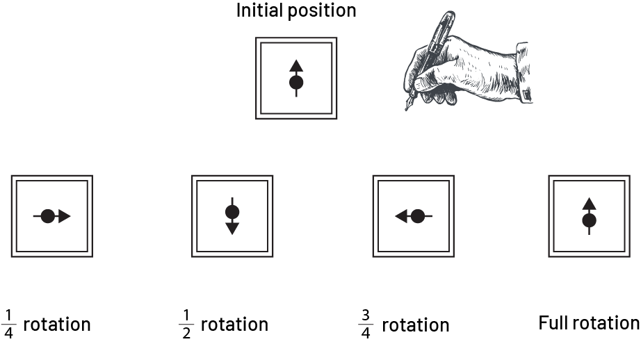 Image a series, of five squares, with a rotation point. Below the first square is written: starting position. Under the second square is written: quarter-turn rotation. Under the third square is written: half-turn rotation. Under the fourth square is written: three-quarter-turn rotation. Under the fifth square is written: complete rotation.