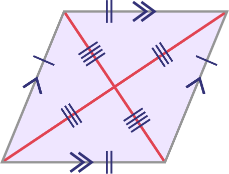 Image a quadrilateral with two sets of equal parallel lines. There is a vertical and a horizontal line intersecting in the centre of the shape, and two oblique lines intersecting in the centre of the shape.
