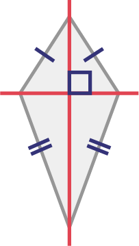 Image a deltoid with two sets of equal lines, each forming an angle. There is a dotted vertical line and a dotted horizontal line which intersect in the centre of the shape.
