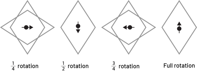 Image Four sets of diamonds are presented. The first is a horizontal diamond superimposed on a vertical diamond. In the centre, there is an arrow pointing to the right. Under it is written: one quarter rotation. The second is a vertical diamond, with an arrow in the centre pointing down. Under it is written: one half rotation. The third is a horizontal diamond superimposed on a vertical diamond. The arrow in the centre points to the left. Under it is written: three quarter rotation. The fourth is a vertical diamond with the arrow in the centre pointing up. Under it is written: full rotation.