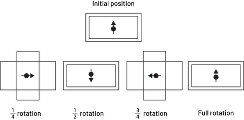 Image Four sets of diamonds are presented. The first is a horizontal rectangle superimposed on a vertical rectangle. In the centre, there is an arrow pointing to the right. Under it is written: one quarter rotation. The second is a horizontal rectangle, with an arrow in the centre pointing down. Under it is written: one half rotation. The third is a horizontal rectangle superimposed on a vertical rectangle. The arrow in the centre points to the left. Under it is written: three quarter rotation. The fourth is a horizontal rectangle with the arrow in the centre pointing up. Under it is written: full rotation.