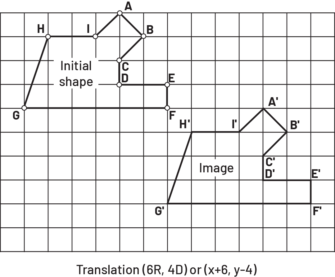 Image A grid in which there are two figures. The first, being the initial figure, is marked by the points “ a ”, “ b ”, “ c ”, “ d ”, “ e ”, “ f ”, “ g ”, “ h ” and “ i ”. The second, being the image, is marked by the points “ a ” prime, “ b ” prime, “ c ” prime, “ d ” prime, “ e ” prime, “ f ” prime, “ g ” prime, “ h ” prime and “ i ” prime. Below the grid is written: translation (opening parenthesis) six “ d ”, four “ b ” (closing parenthesis) or (opening parenthesis) six, minus four (closing parenthesis).