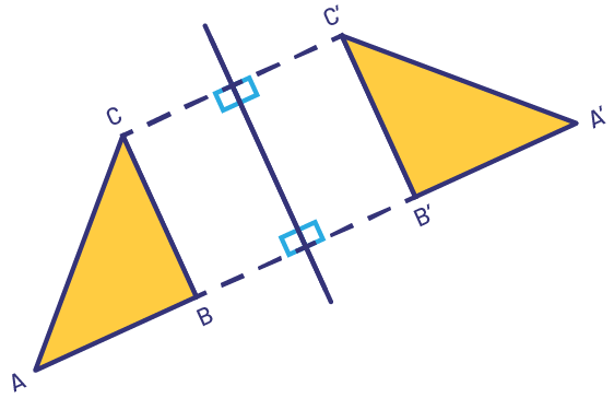Image a figure made up of a rectangle and two triangles marked by the points “ a ”, “ b ” and “ c ”, and the points “ a ” prime, “ b ” prime and “ c ” prime respectively. There is a line passing through the centre of the rectangle. Four square angles are indicated in the figure.