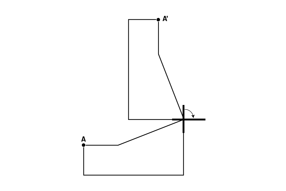 Image There are three figures. The first is marked by a point “ a ” at one of the peaks. The second figure is marked by a point “ a ” prime. The third figure is inversed and marked by a point “ a ” double prime. The second and third figures are linked by two lines of different lengths which intersects at a rotation point. Under the two first figures, there is a horizontal arrow.