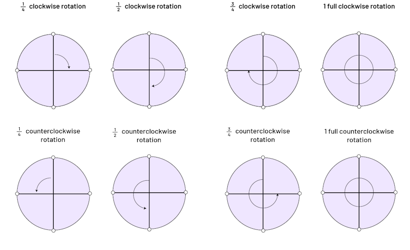 Image there are eight circles divided in quarters. There is a curved arrow in the first quadrant of the first circle. Above is written: a quarter clockwise rotation of the needles of a watch. There is a curved arrow passing through the first and fourth quadrants of the second circle. Above is written: a half clockwise rotation of the needles of a watch. There is a curve arrow passing through the first, fourth, and third quadrants. Above is written: three-quarter clockwise rotation of the needles of a watch. There is a smaller circle in the fourth circle. Above is written: one full clockwise rotation of the needles of a watch. There is a curved arrow in the second quadrant of the first circle. Above is written: a quarter counter-clockwise rotation of the needles of a watch. There is a curved arrow passing through the second and third quadrants of the second circle. Above is written: a half counter-clockwise rotation of the needles of a watch. There is a curve arrow passing through the second, third, and fourth quadrants. Above is written: three-quarter counter-clockwise rotation of the needles of a watch. There is a smaller circle in the fourth circle. Above is written: one full counter-clockwise rotation of the needles of a watch.