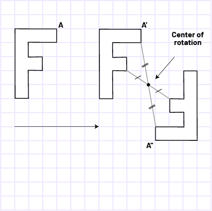 The original shape (A) is translated six units to the right (A’) and rotated around a point outside the shape 180° clockwise (A’’).