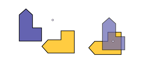 Image There are two sets of figures. In the first, there are two congruous figures with different orientations. Between the two figures there is a point. In the second, the two figures are superimposed and there is a point in the centre of the two figures.