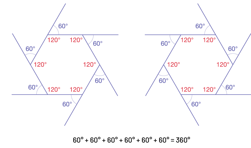Image there are two hexagons for which the angles are measured counterclockwise to the needles of a watch in the first figure and clockwise to the needles of a watch in the second. Below the hexagon is written: 60 degrees plus 60 degrees plus 60 degrees plus 60 degrees plus 60 degrees equals 360 degrees.