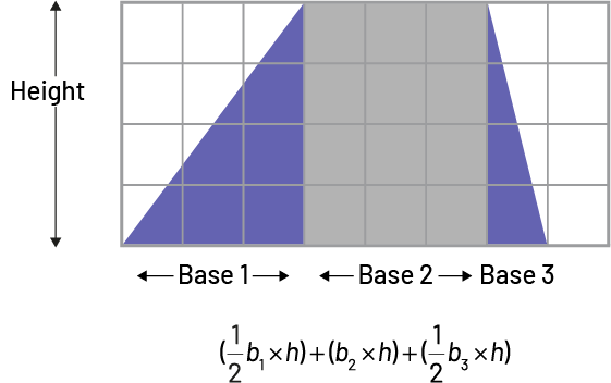 Image there is a grid with eight columns and four rows. In the grid there is a trapeze that is divided in two triangles and one parallelogram. The height, of the figures is indicated by an arrow, first base. The base of the parallelogram is base two and the base of the second triangle, base three. Below the grid these is an equation: (opening parenthesis) a half “ b ” index one, multiplied by “ h ” (closing parenthesis), plus, (opening parenthesis) “ b ” index two, multiplied by “ h ” (closing parenthesis), plus (opening parenthesis) half “ b ” index three, multiplied by “ h ” (closing parenthesis).