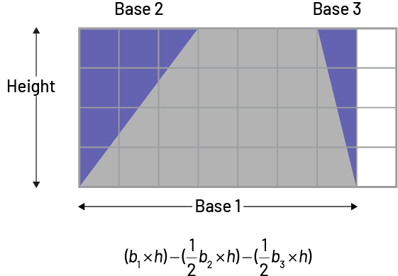 Image There is a grid of eight columns and four rows. In the grid, there is a trapeze and two triangles, which form a rectangle. This quadrilateral is divided by its height, its base one and its base two. Below the grid, there is an equation:(opening parenthesis) “ b “ index one, multiplied by “ h ” (closing parenthesis), minus (opening parenthesis) one half “ b ” index two, multiplied by “ h “ (closing parenthesis), minus (opening parenthesis) one half “ b ” index three, multiplied by “ h ” (closing parenthesis).