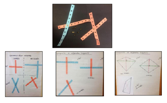 The exploration of the diagonals of the quadrilaterals can also be done using strips of paper with holes (for example., dot matrix paper) and brass plated fasteners or plastic sticks (such as GeoStix). The strips of paper can be used to represent the diagonals and fixed with the fasteners. Thus, students can think about the properties and characteristics of the different geometric shapes. They can then group the quadrilaterals into classes, according to the properties of their diagonals, such as number of diagonals, whether the diagonals bisect each other, and the presence or absence of a 90 degree angle at their intersection.
