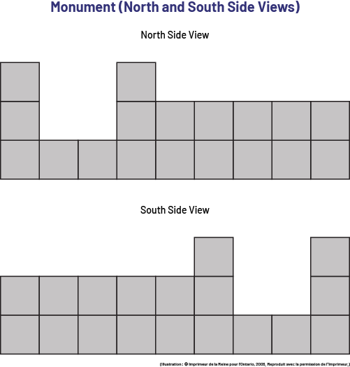 Image the view of a monument, from two different perspectives represented in squares. Above the first figure is written: North side view. Above the second figure is written: South side view. Above is written: monument (opening parenthesis) North and South side views (closing parenthesis).