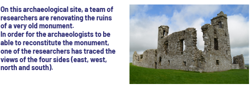Image there is a photo of an ancient monument in ruins. To the left is written: On this archaeological site, a team of researchers are renovating the ruins of a very old monument. In order for the archaeologists to be able to reconstitute the monument, one of the researchers has traced the views of the four sides (opening parenthesis) east, west, north and south (closing parenthesis).
