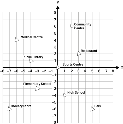 Image a cartesian plane on which there are points representing a community centre, a restaurant, a secondary school, a parc, a grocery store, an elementary school, a municipal library, and a medical centre.