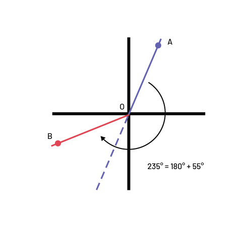 Image there are two line segments. In the first quadrant, there is a point “ a “ from which an oblique line crosses the first and the third quadrant, passing by the point “ o “. A second starts from the point “ b “ and stops at the point “ o “. In the corner is written: 235 degrees equals 180 degrees plus 55 degrees.