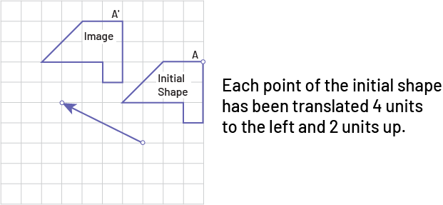 image A figure is on a grid plane. An arrow indicates the direction and length of the translation. In this case if the translation will be 2 units up and 4 units left.A second figure represents the translation. « Each point of the initial figure has undergone a translation of 4 units to the left and 2 units upwards » .