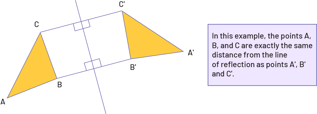 image A triangle « A » « B » « C » and its reflection, « A » prime, « B » prime, « C » primes. Think lines were placed between « C » and « C » prime, and between « B » and « B » prime.The axis of reflection is perpendicular to these two lines.In a box, we can read: In this example, the points « A », « B » , « C » are exactly at the same distance from the axis of reflection as the points « A » prime, « B » prime, et « C » primes.