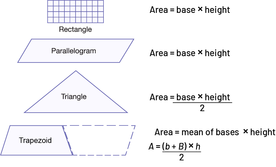 image A rectangle.Area equals base multiplied by height.A parallelogram.Area equals base multiplied by height.Triangle.Area equals base multiplied by height, divided by 2.Trapeze.Mean equal area of the bases multiplied by height.« A » equals (opening parenthesis) « b » plus « B » (closing parenthesis) multiplied by « h », divided by 2